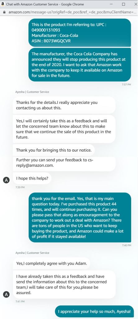We are asking that everyone reach out to Amazon and tell them Coca-Cola is planning to stop production of TaB at the end of the year, and you’d like them to work with the company to develop a plan to keep producing it and selling it on their platform.