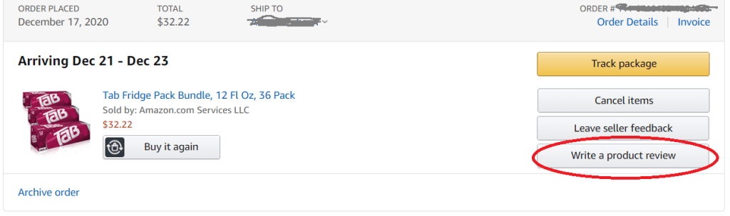 Finally, if you’ve purchased TaB on Amazon before, we’d like you to write a positive product review. To do this, go to your orders, and locate the TaB purchase, and select “write a product review.” If you’ve already written a review, this option will not be available.