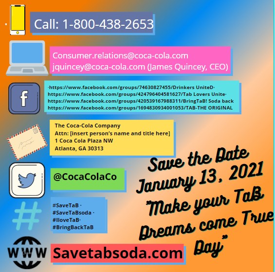 All of us will be asking Coca-Cola to help us on national Make Your Dreams Come True Day by Saving TaB from the history books and bringing it back!