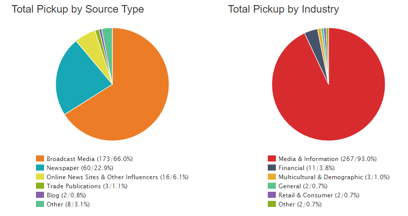 Outlets included entities such as: Local stations (Fox, CBS, NBC, ABC), Newspapers, Online Media, etc. (see graphs below):