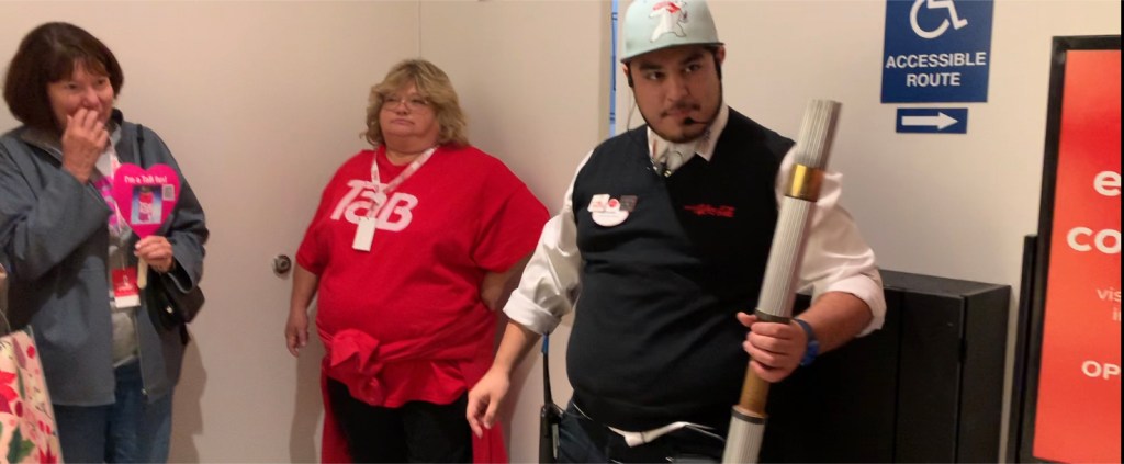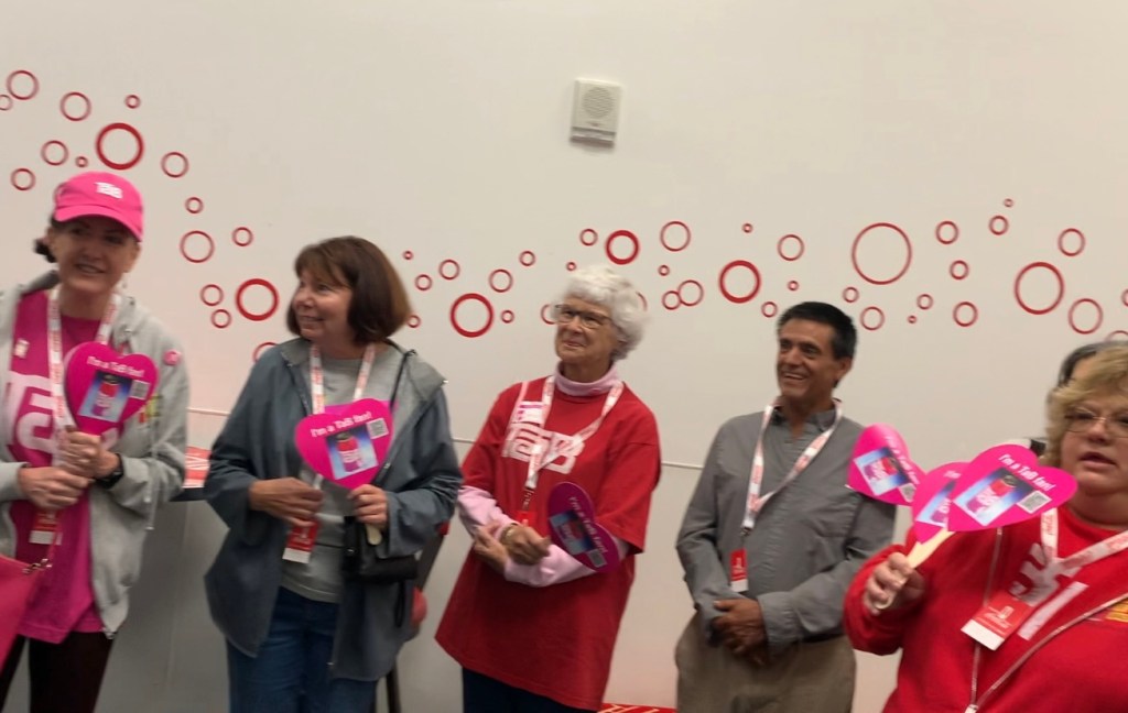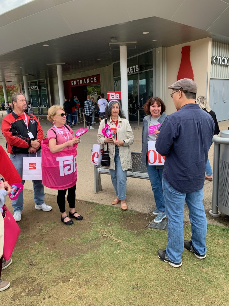 When we arrived at World of Coca-Cola, we were all wearing various TaB-themed apparel (one person even wore a TaB can costume). Of course we worked throughout our visit to win over other guests in the venue as well to convert them into TaB fans. We handed out plenty of actual “TaB fans” (cardboard heart-shaped fans with a picture of TaB that said “I’m a TaB fan” and even a QR code to sign our petition). Many of the other guests and staff at World of Coca-Cola were pleased to see us (a lot of “I remember TaB…” impromptu conversations happened) and happily accepted our “TaB fans” as gifts. In fact, the security guard who let us in the gate, holding one of our TaB fans, greeted us with “Welcome to World of Coca-Cola—there’s plenty of TaB here for you to enjoy today.”
