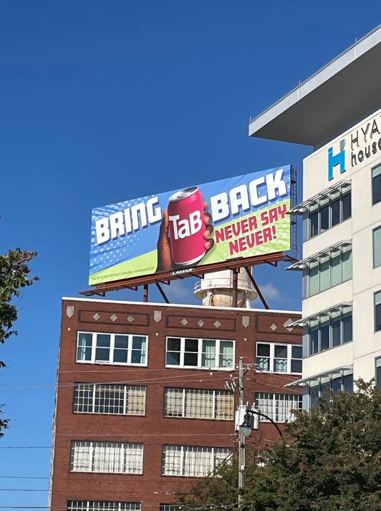 This week, downtown Atlanta lit up with a bold message: “Bring TaB Back.” The billboard, perched at the corner of Marietta Street and Ivan Allen Boulevard, is more than just a sign—it’s a declaration. A love letter to the soda that defined generations, and a call to action for Coca-Cola to recognize the enduring spirit of its original zero sugar cola drink.