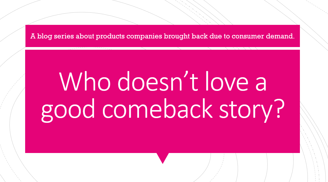 We’re here to Save TaB! If you’re reading this, you may be wondering “how likely is it that Coca-Cola will change its mind and bring it back; what are our chances of saving it?” You’re not alone—we wonder that too. And while we can’t know for sure—we do know that many companies have brought previouslyContinue reading “Part I: Product Comeback Stories!”
