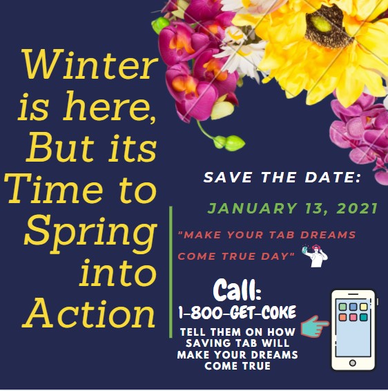 What: “Make Your TaB Dreams Come True” When: 1/13/2021 (all day) How: We will be calling Coca-Cola at 800.GET.COKE All of us will be asking Coca-Cola to help us on national Make Your Dreams Come True Day by Saving TaB from the history books and bringing it back! How will this be successful? Strength inContinue reading “Our January Event – Save the Date”